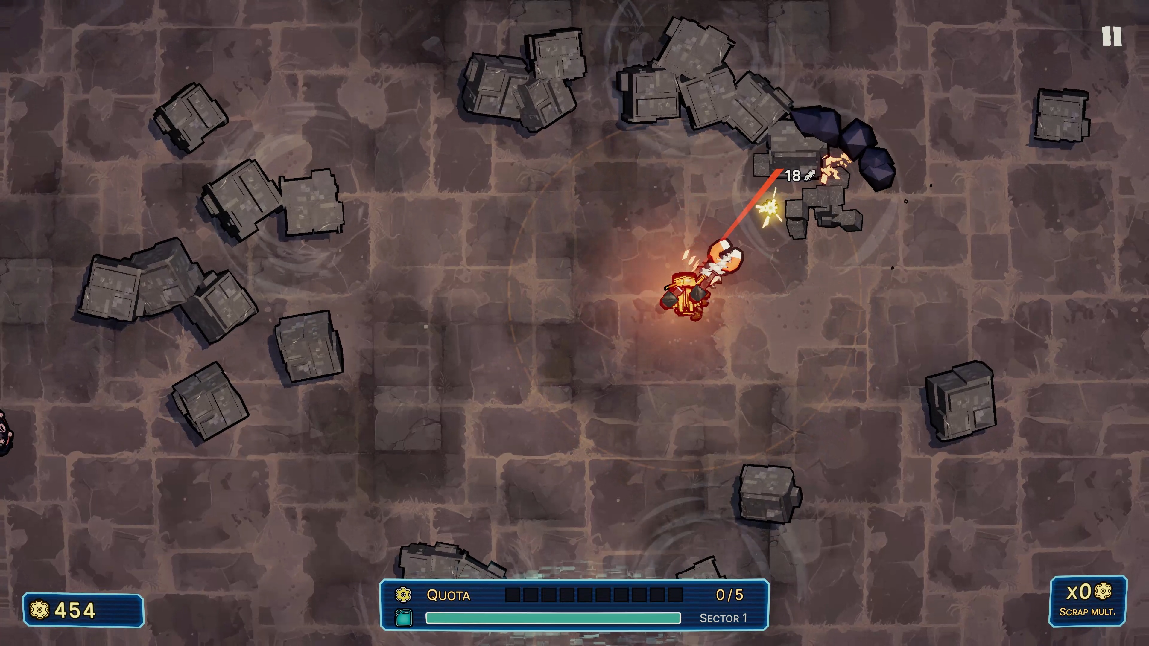 This is not a passive idle game. You control S.C.R.A.P. entirely with the mouse in short, focused runs. Every action is deliberate.